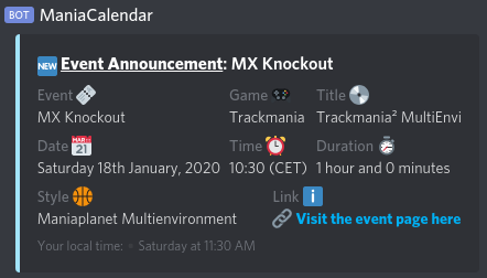 We introduce a new integration of ManiaCalendar. From now on you could integrate it to your Discord by adding ManiaCalendar to inform you and your guests of new announced dates and reminders of upcoming events.